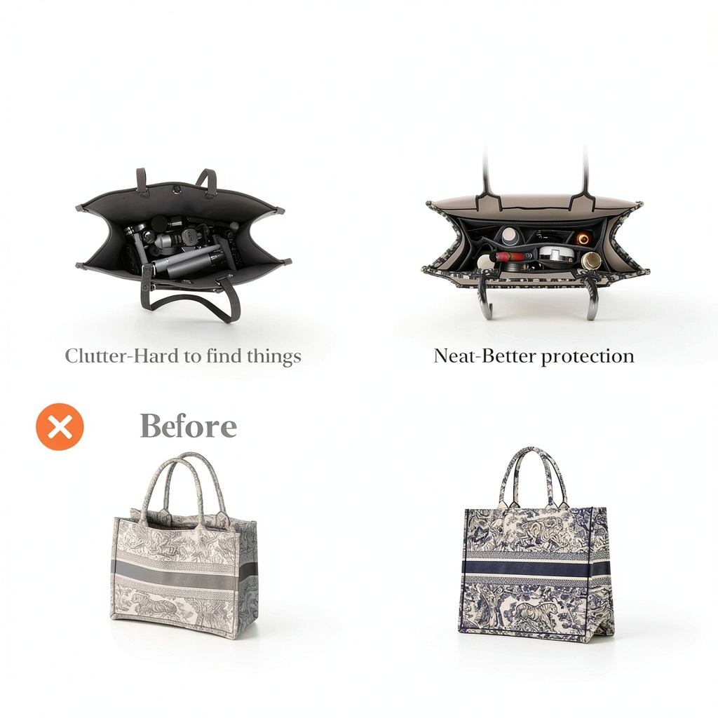 It is designed to fit Dior Book Tote and LV Onthego bags in both large and medium sizes, with precise dimensions to ensure a snug fit without altering the bag’s structure.